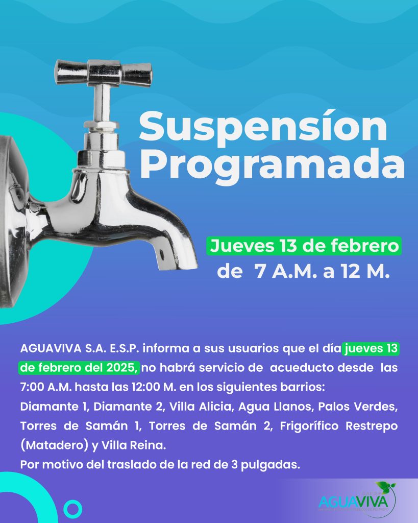 AGUAVIVA S.A. E.S.P. informa a sus usuarios que el día jueves 13 de febrero del 2025, no habrá servicio de acueducto desde las 7:00 A.M. hasta las 12:00 M. en los siguientes barrios: