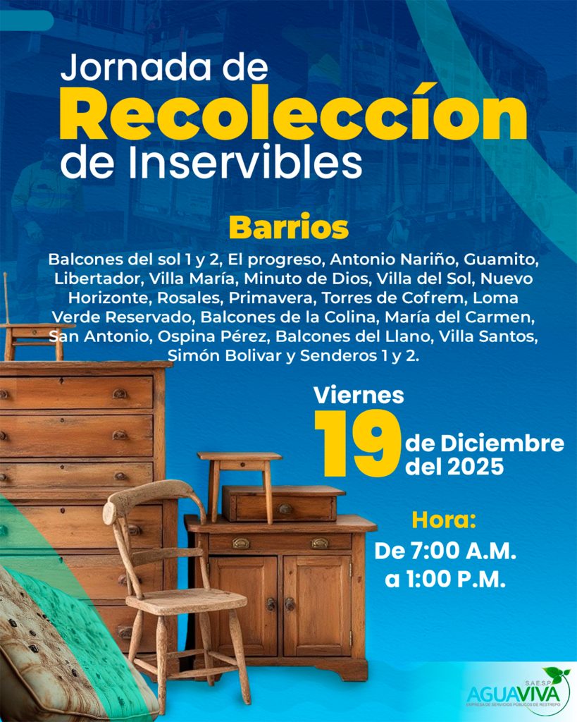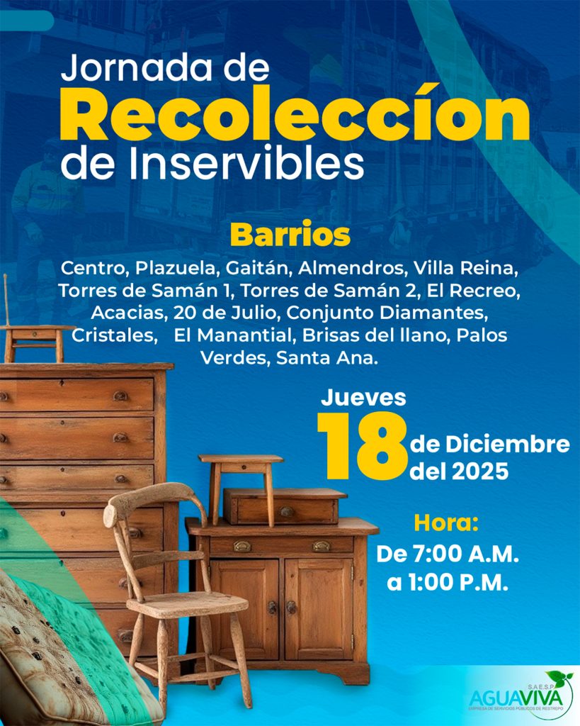 Informamos a la comunidad que el servicio de recolección de inservibles del mes de diciembre se realizará los días jueves 18 y viernes 19 de diciembre del 2025. Debido a la temporada navideña se adelantan los días de recolección de inservibles, agradecemos su comprensión y colaboración.