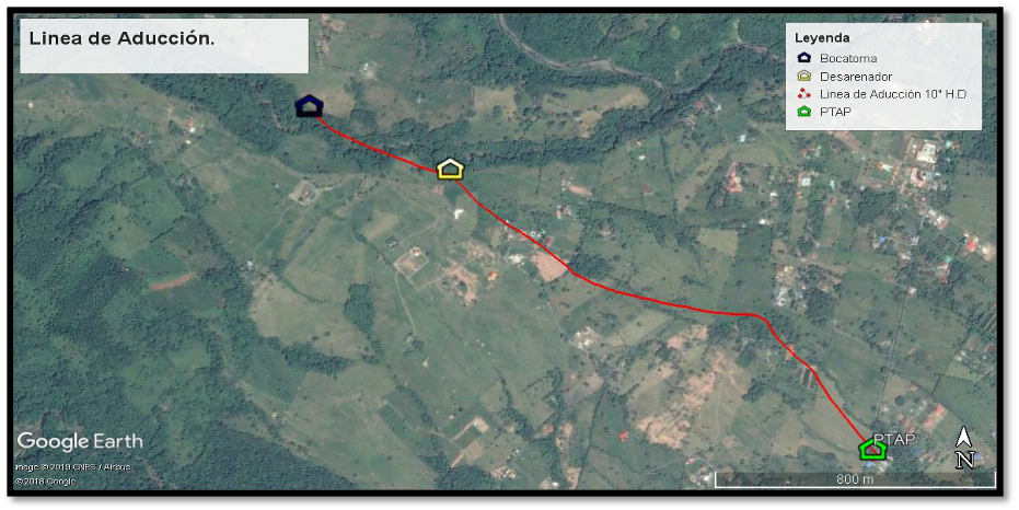 La línea de aducción, está comprendida en dos tramos, el primero parte de las coordenadas 4°17’17.76″N, 73°35’7.26″W, salida de la bocatoma, en una tubería de hierro dúctil de diámetro 10”, con una longitud de 400m hasta el desarenador localizado en las coordenadas 4°17’11.21″N, 73°34’54.06″W, en una tubería de hierro dúctil de diámetro 10”, con una longitud de 1590m; de ahí sale hasta la planta de tratamiento de agua potable localizada en el punto 4°16’42.15″N, 73°34’14.88″W.