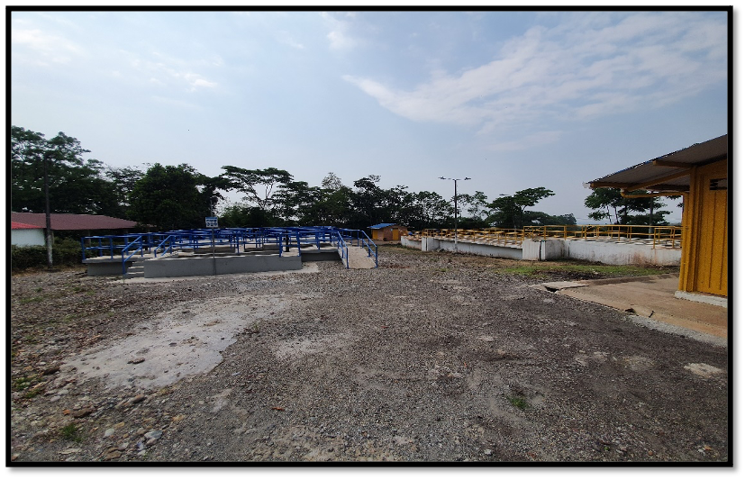 El desarenador se encuentra ubicado en las coordenadas 4°17’11.21″N, 73°34’54.06″W, aproximadamente a 400 m de la estructura de captación, esta unidad es de tipo convencional, de flujo ascendente; construido en concreto reforzado, el agua proveniente de la cámara de aducción llega a través de una tubería instalada en hierro dúctil con un diámetro de 10”, ingresa a la cámara de aquietamiento para regular la velocidad del caudal entrante donde se encuentra una pantalla deflectora y posteriormente ingresa a la zona de sedimentación donde se da inicio al pre tratamiento que consiste en decantar sólidos y partículas suspendidas, finalmente el caudal por rebose se conduce a un vertedero de salida para luego ser transportado hasta la planta de tratamiento a través de otra tubería de hierro dúctil de 10”.