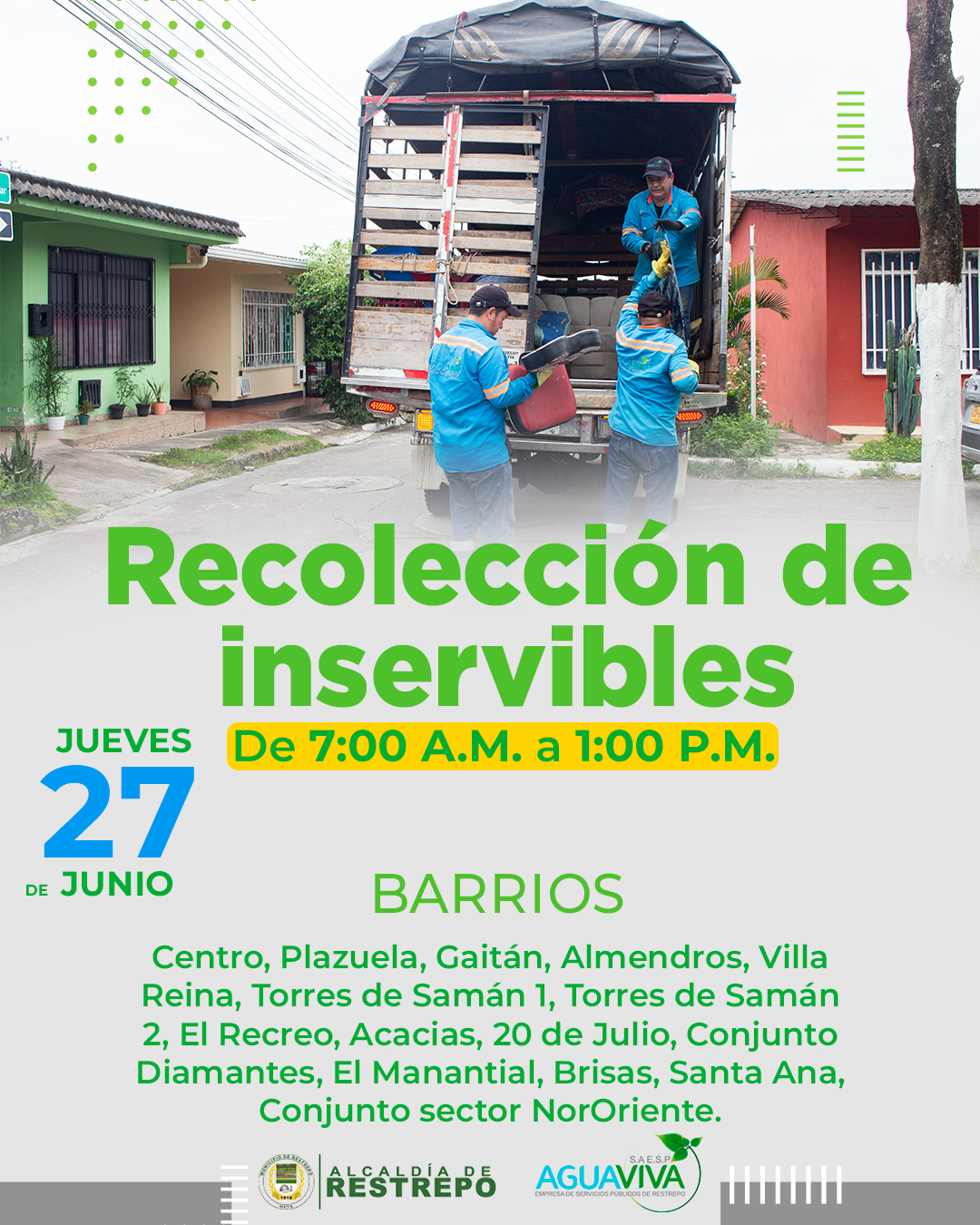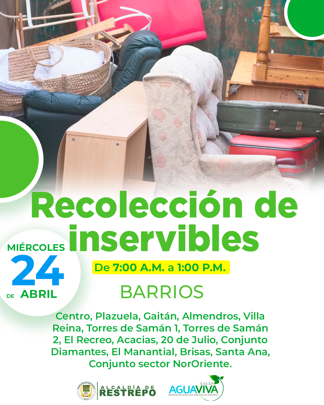 Recolección de inservibles del mes de abril. Para el mes de abril está programada la recolección de inservibles los días miércoles 24 y jueves 25 de abril.