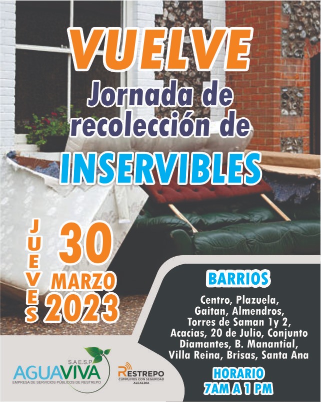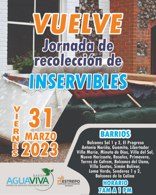 Los camiones de recolección estarán disponibles el día 30 de Marzo en el sector Sur Oriental del Centro hasta Villa Reina y el 31 de Marzo en el sector Sur Occidental desde el Ospina Pérez hasta COFREM. Por favor estar atentos a estas fechas. Recuerda que sólo se aceptarán artículos que no sean peligrosos o tóxicos, como baterías, productos químicos o materiales inflamables. Tampoco escombros ni icopores.